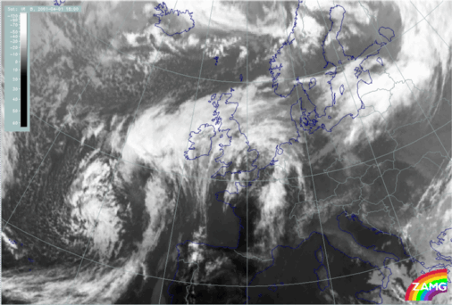 In the VIS image the whole frontal cloud band is characterized by high pixel values. In contrast to this the pixel values in the IR and WV images depend on the location of the cross section as well as on the stage of development. During the initial stages the pixel values of the IR and WV images within the area of the dry intrusion, close to the point of the Occlusion, are characterized by lower values typical for low and mid-level cloudiness. Downstream of the cloud spiral the pixel values are increasing continuously. During the maturing stages, when the cloud spiral is also accompanied by high cloudiness within the whole cloud spiral, the pixel values are as high as in case of an Occlusion of the Warm Conveyor Belt type (see Occlusion: Warm Conveyor Belt Type ).