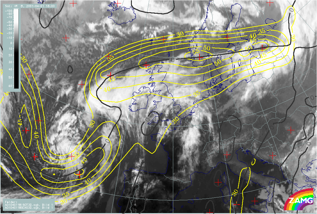 01 April 2001/18.00 UTC - Meteosat IR image; yellow: isotachs 300 hPa, black: zero line of shear vorticity 300 hPa