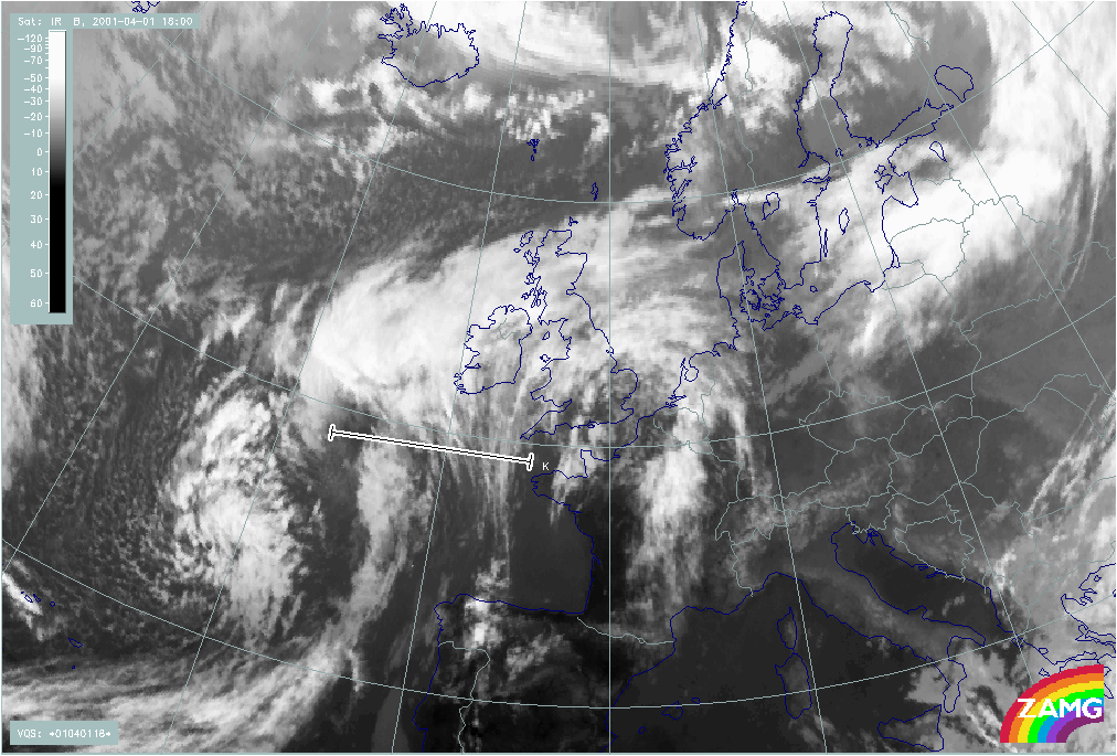 01 April 2001/18.00 UTC - Meteosat IR image; position of vertical cross section indicated