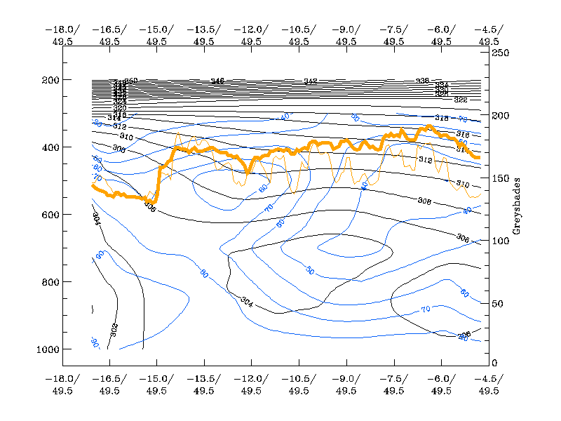 21 June 2005/00.00 UTC - Vertical cross section; black: isentropes (ThetaE), blue: relative humidity, orange thin: IR pixel values, orange thick: WV pixel values