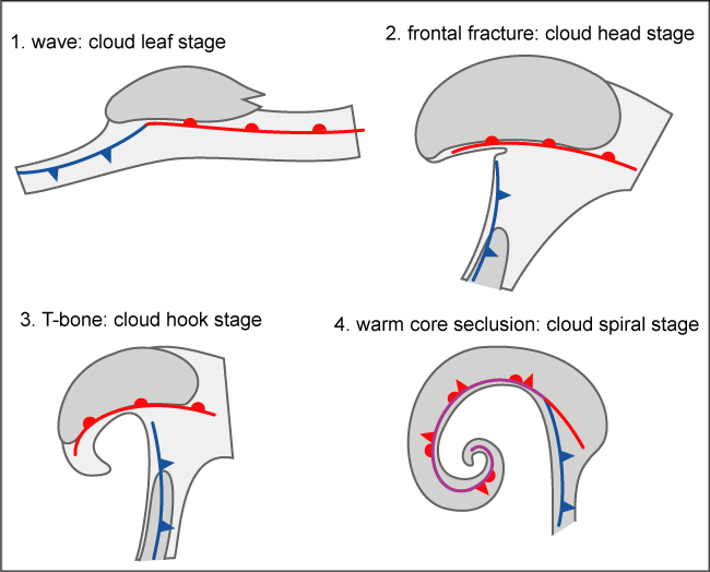 The classical development of an Occlusion (Warm Conveyor Belt Type) is described in the well-known polar Front theory after Bergeron as the development from a Wave to an Occlusion stage.