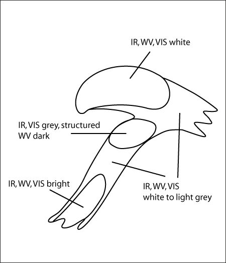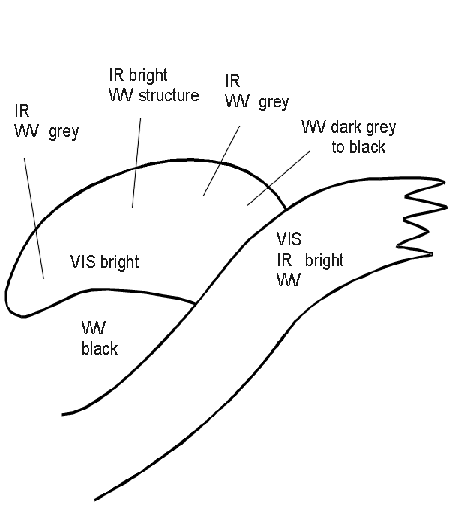 | IR | Much greyer than the white CF-WF cloud band; brighter in the direction of the spiral tip to the Southwest. |