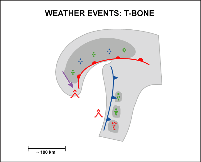 T-Bones are frontal structures that are usually associated with rapidly deepening lows. Heavy rain occurs ahead of the Warm Front, and stormy winds around its tail, especially in systems over the ocean. Contrary to a Cold Conveyor Belt Occlusion, there is no precipitation associated with the Cold Front located near to the Warm Front.