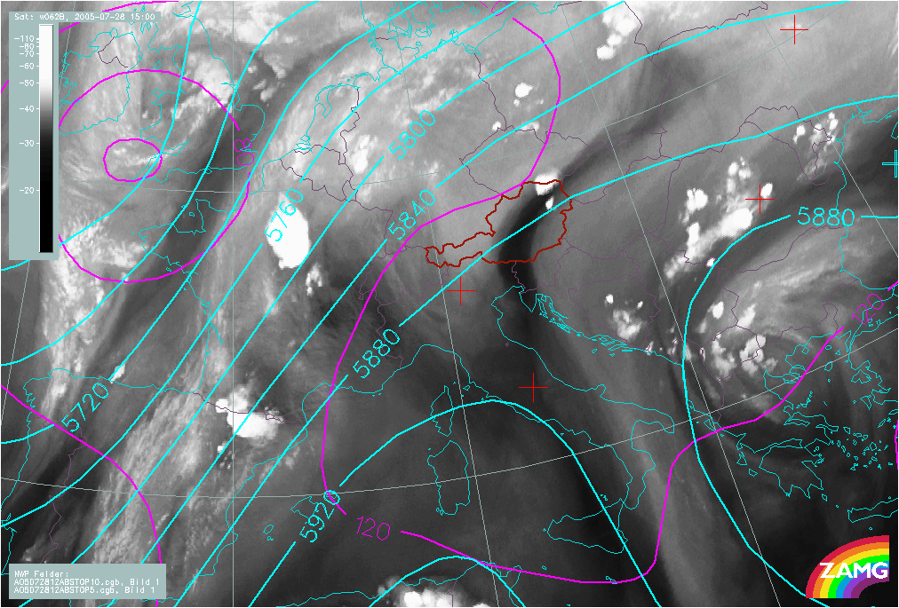 28 July 2005/12.00 UTC - Meteosat 8 IR 10.8 image; magenta: height contours 1000 hPa, cyan: height contours 500 hPa