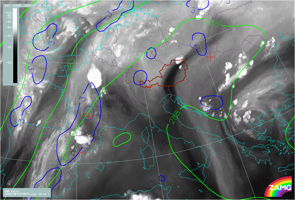 28 July 2005/12.00 UTC - Meteosat 8 IR10.8 image; blue: thermal front parameter (TFP) 500/850 hPa, green: equivalent thickness
