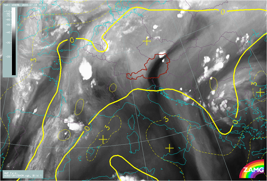 28 July 2005/12.00 UTC - Meteosat 8 IR10.8 image; yellow: Showalter index 500/850 hPa