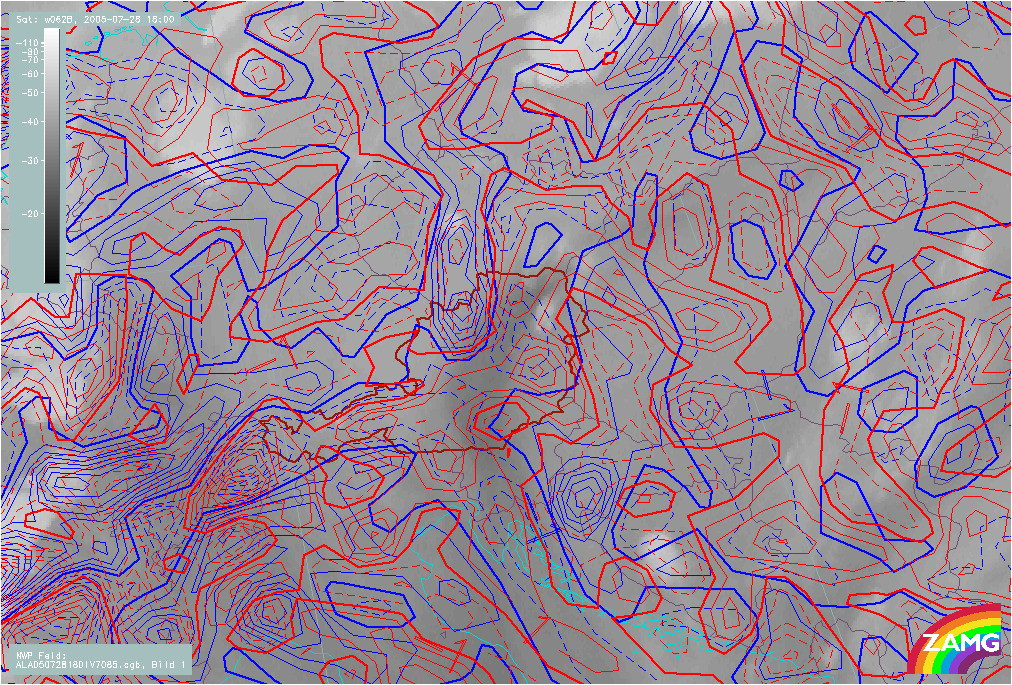 28 July 2005/18.00 UTC - Meteosat 8 WV 6.2 image; red dashed: convergence 850 hPa, blue dashed: convergence 700 hPa