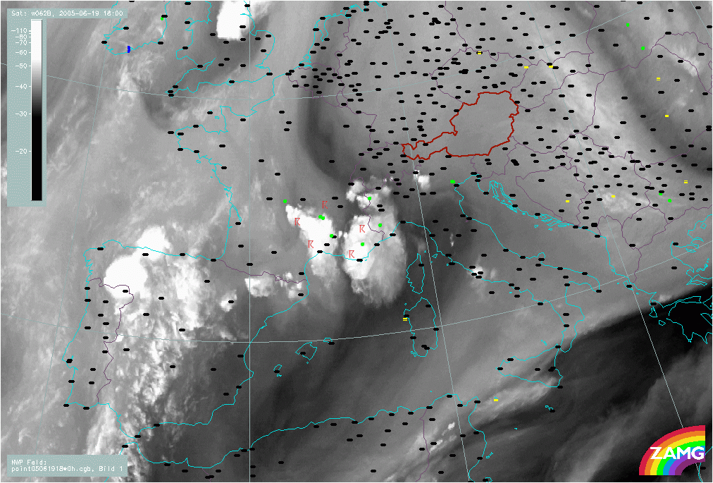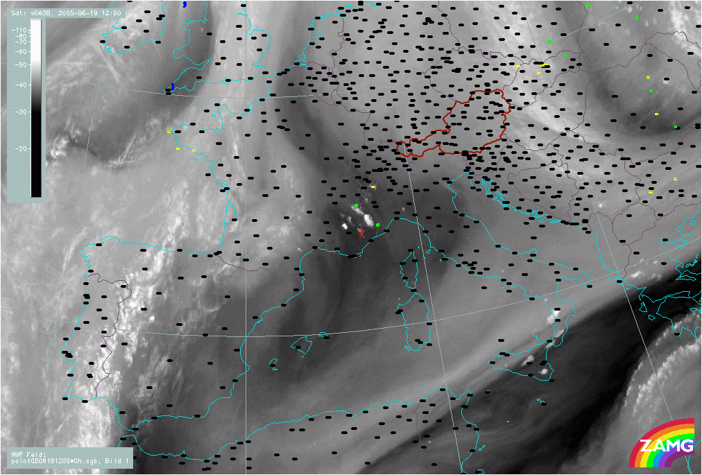 19 June 2005/12.00 UTC - Meteosat 8 WV 6.2 image; weather events (green: rain and showers, blue: drizzle, cyan: snow, red: