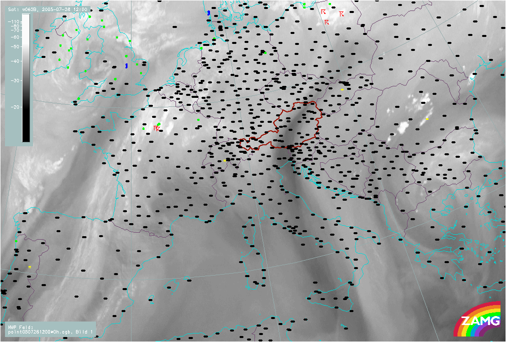 28 July 2005/12.00 UTC - Meteosat 8 WV 6.2 image; weather events (green: rain and showers, blue: drizzle, cyan: snow, red: