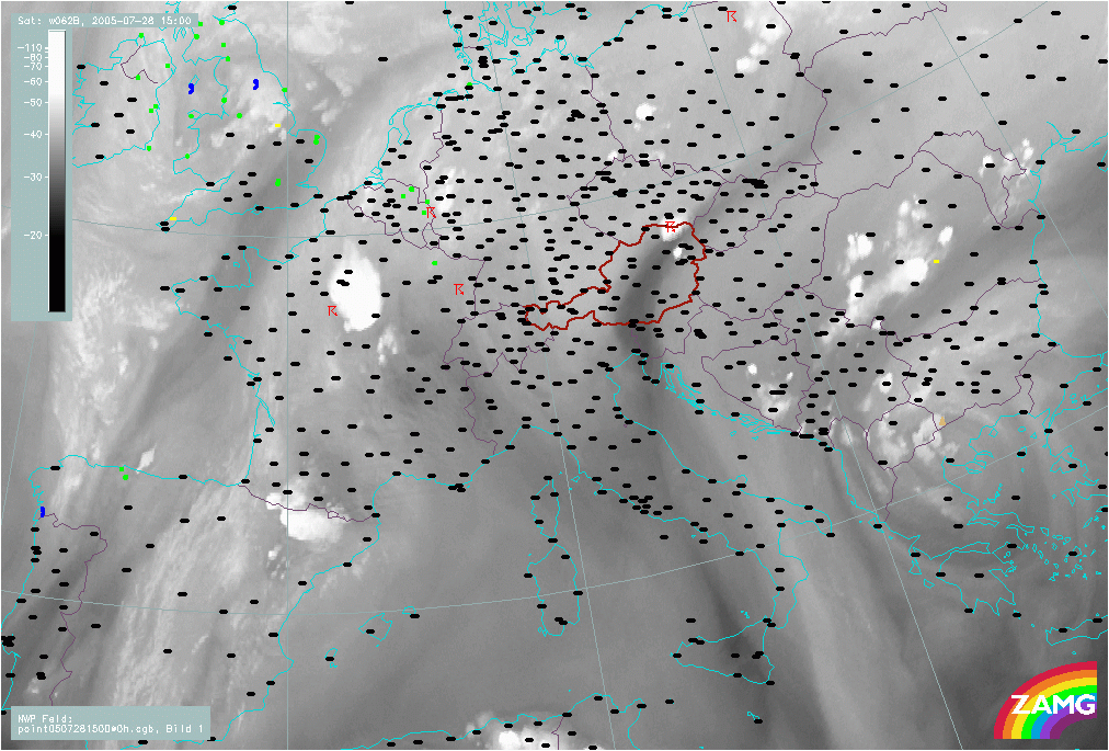 28 July 2005/15.00 UTC - Meteosat 8 WV 6.2 image; weather events (green: rain and showers, blue: drizzle, cyan: snow, red: