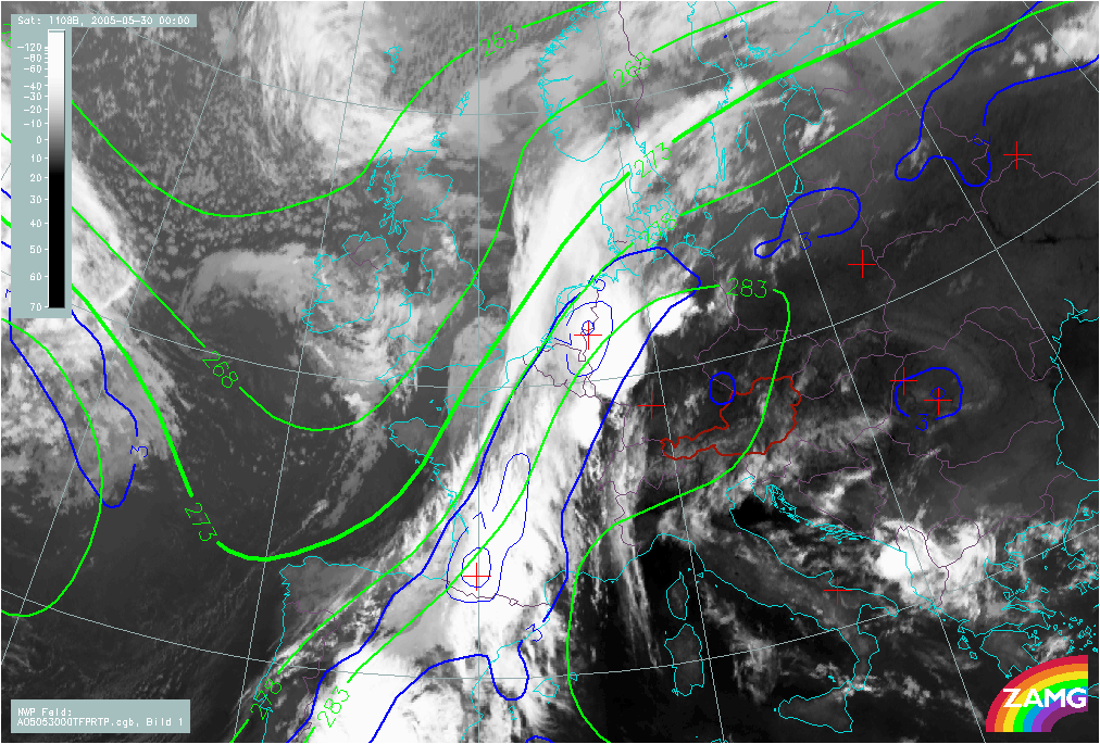 30 May 2005/00.00 UTC - Meteosat 8 IR10.8 image; blue: thermal front parameter 500/850 hPa, green: equivalent thickness 500/850