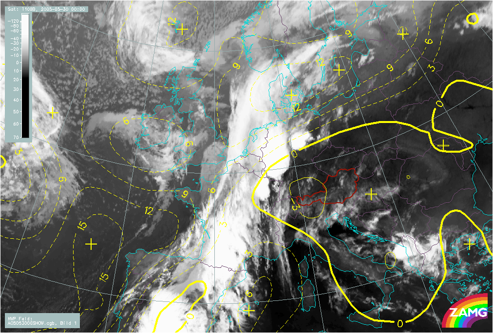 30 May 2005/00.00 UTC - Meteosat 8 IR10.8 image; blue: thermal front parameter 500/850 hPa, green: equivalent thickness 500/850 hPa