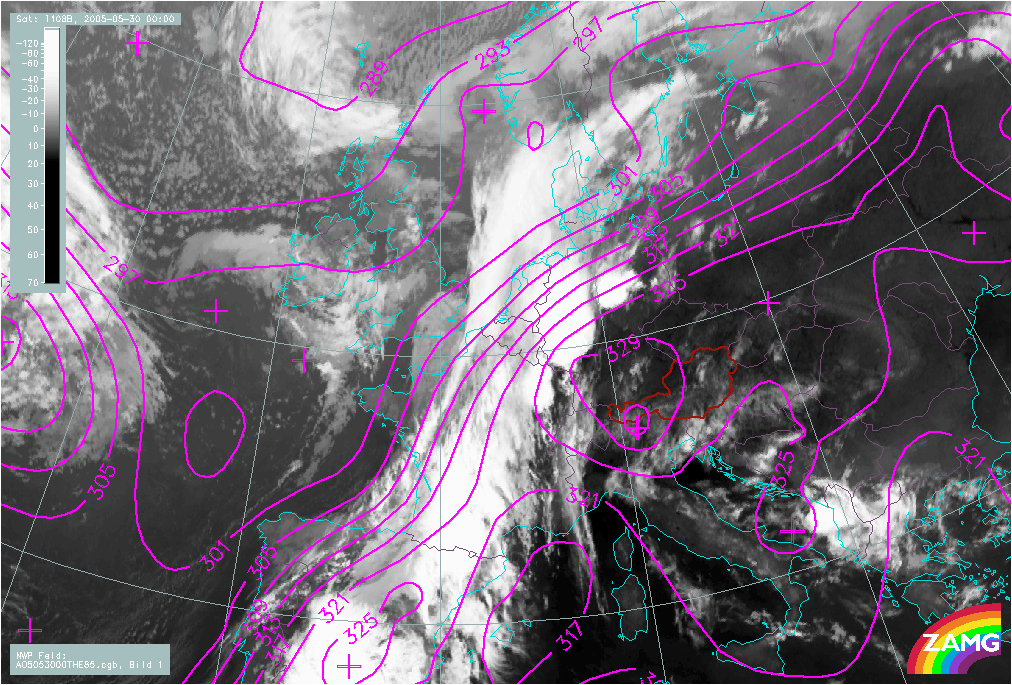 30 May 2005/00.00 UTC - Meteosat 8 IR10.8 image; blue: thermal front parameter 500/850 hPa, magenta: ThetaE 850 hPa