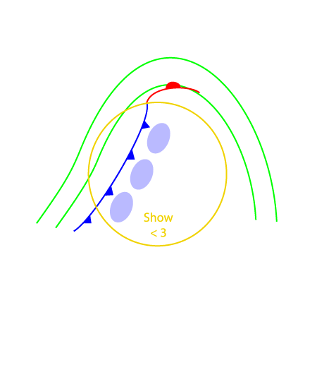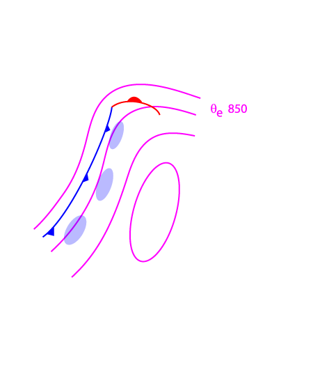 Typical configurations for fronts and thickness ridges are described in detail by the relevant conceptual models (see also Cold Fronts, Warm Fronts). In this case, the typical area for the initiation of convection is along the leading edge of a Cold Front cloud band, immediately in front of the TFP and an area of high thickness gradients.