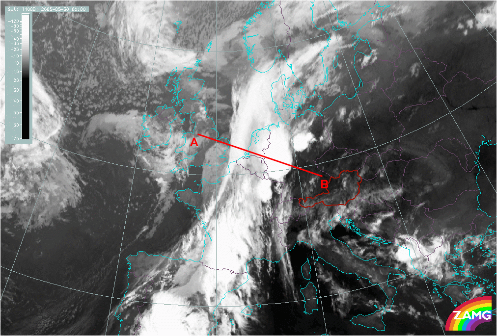 30 May 2005/00.00 UTC - Meteosat IR10.8 image; position of vertical cross section indicated