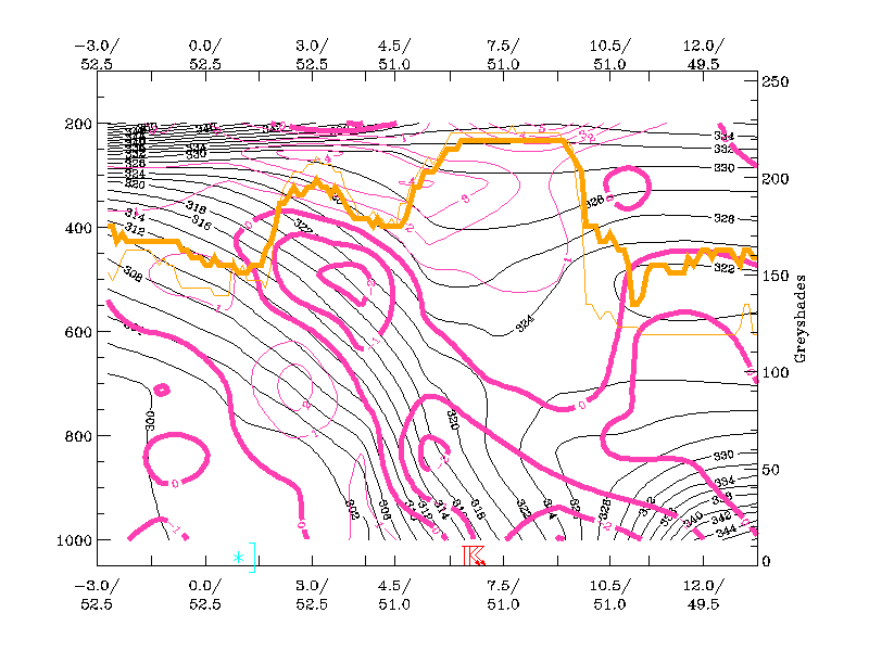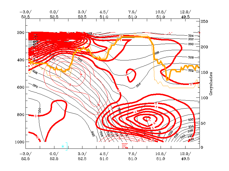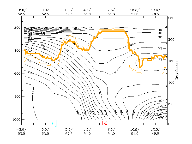 30 May 2005/00.00 UTC - Vertical cross section; black: isentropes (ThetaE), orange thin: IR pixel values, orange thick: WV pixel