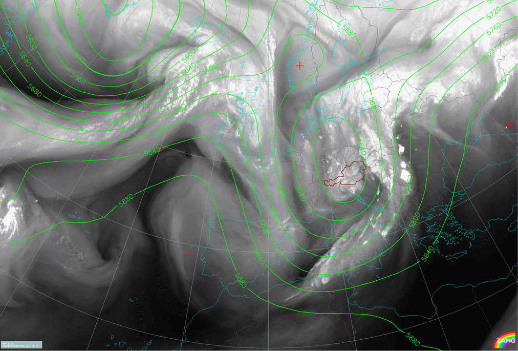 04 August 2006/12.00 UTC - Meteosat 8 WV6.2 image; green: height contours 500 hPa