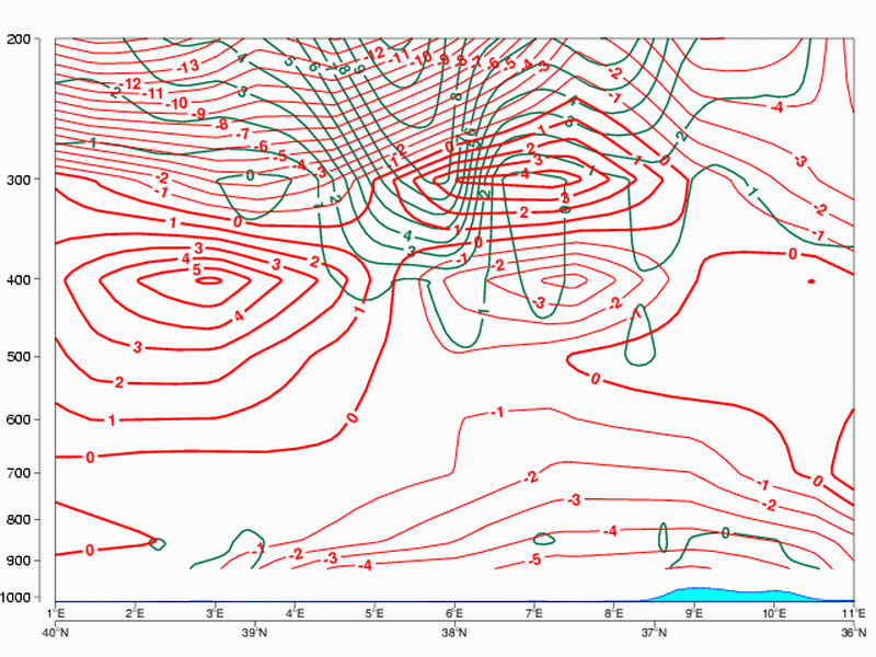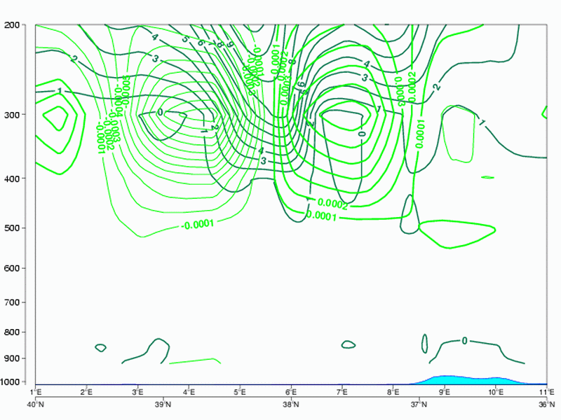 04 August 2006/12.00 UTC - Vertical cross section; dark green: potential vorticity, cyan: vertical motion (omega)