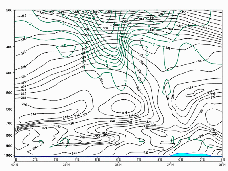 04 August 2006/12.00 UTC - Vertical cross section; dark green: potential vorticity, black solid: isentropes