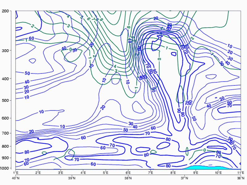 04 August 2006/12.00 UTC - Vertical cross section; dark green: potential vorticity, blue: relative humidity