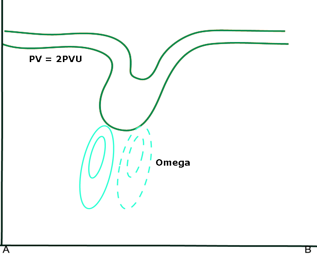 Schematic of PV anomalies in the upper troposphere and the connected vorticity advection and omega patterns