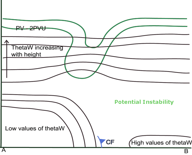A sharp gradient of isentropes near the surface indicates the surface cold front (CF). To the rear of this CF, high values of ThetaW occur. The