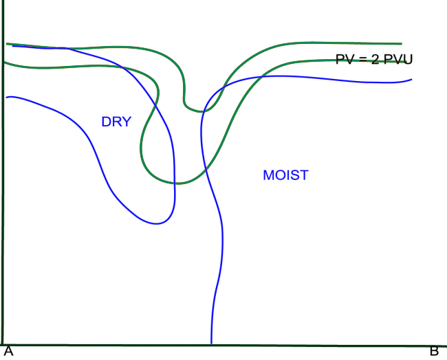 The distribution of geopotential height often shows a large trough, the trough axis coincident with the highest values of PV. However, the PV field gives a better overview of smaller scale features (see Additional Parameters Indicative Of The Diagnosis Of Cloudiness: Potential Vorticity