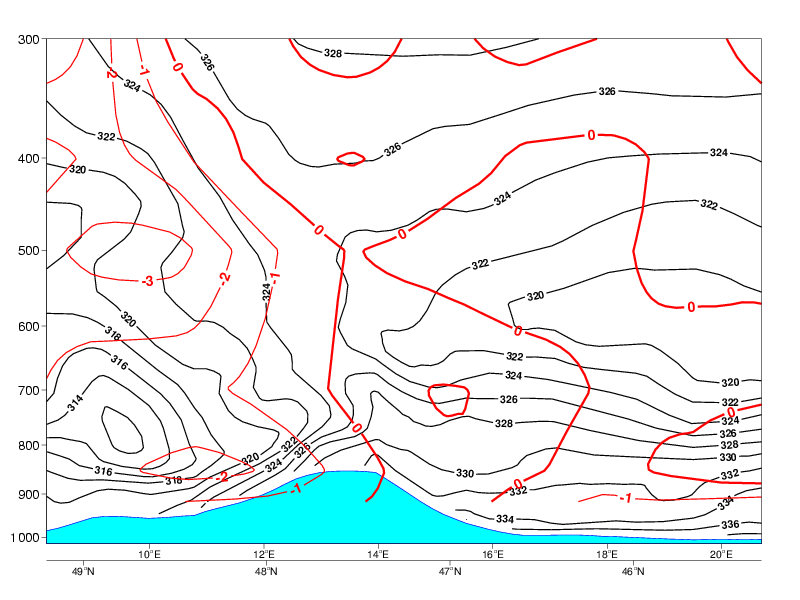 08 August 2004/18.00 UTC - Vertical cross section; black: isentropes (ThetaE)