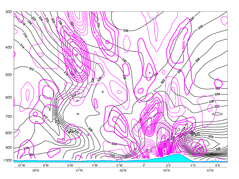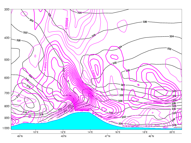 11 June 2004/18.00 UTC - Vertical cross section; black: isentropes (ThetaE), magenta: divergence