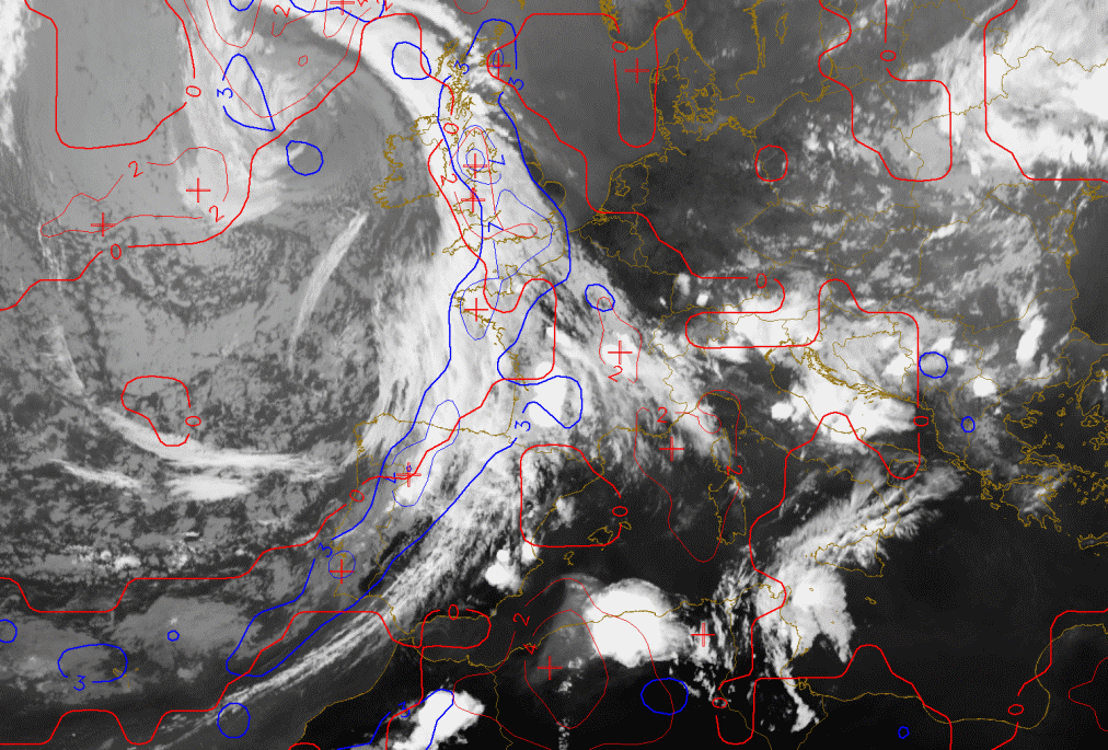 The satellite images show a frontal system over the Iberian peninsula and France. The Cold Front extends from Gibraltar across Spain further