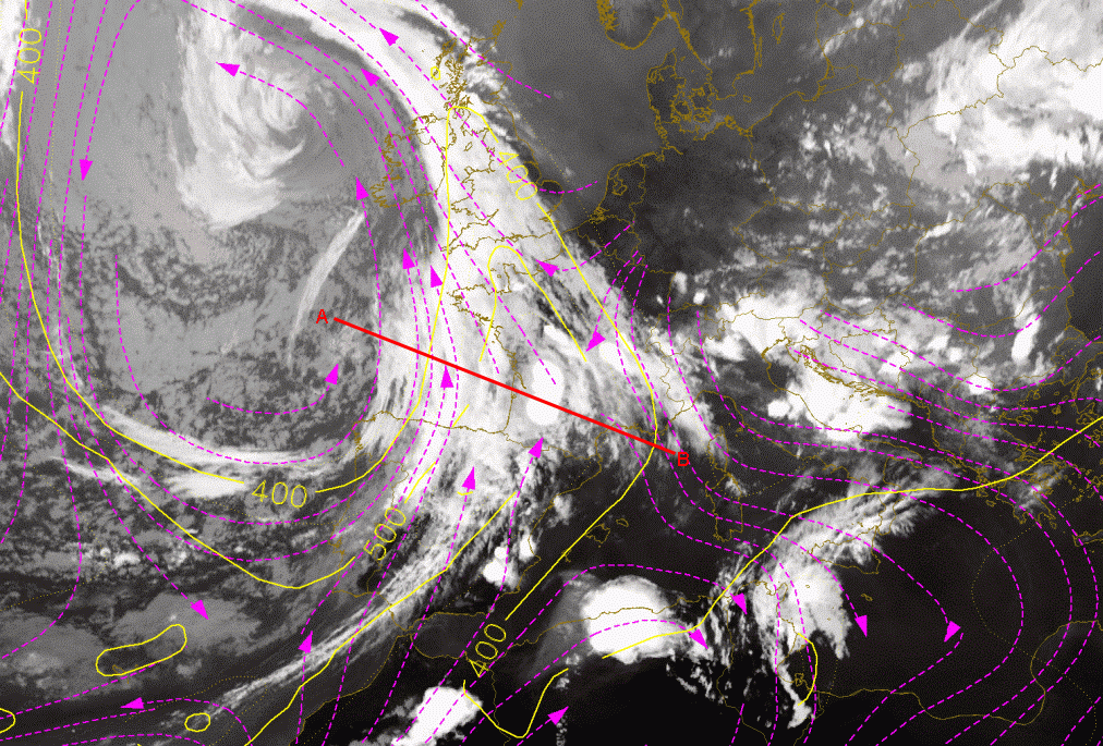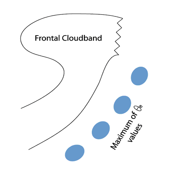 The above diagrams show a cross section across the frontal cloud band and the MCSs which have developed ahead of the cloud band.
