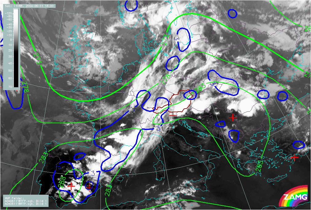 11 June 2004/18.00 UTC - Meteosat 8 IR 10.8 image; lines: blue: thermal front parameter 500/850 hPa, green: equivalent thickness