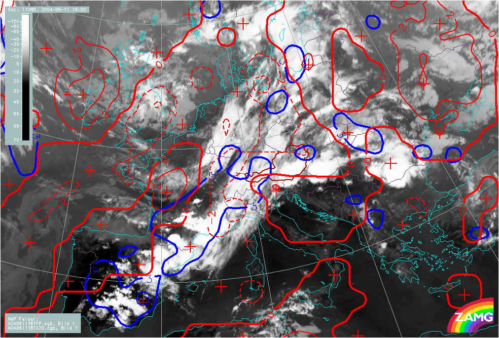 11 June 2004/18.00 UTC - Meteosat 8 IR 10.8 image; lines: blue: thermal front parameter 500/850 hPa, red: temperature advection 700