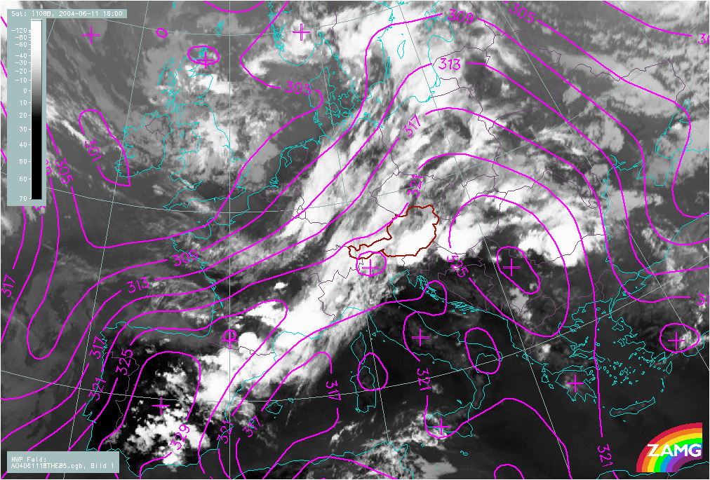 11 June 2004/18.00 UTC - Meteosat 8 IR 10.8 image; magenta: equivalent potential temperature 850 hPa