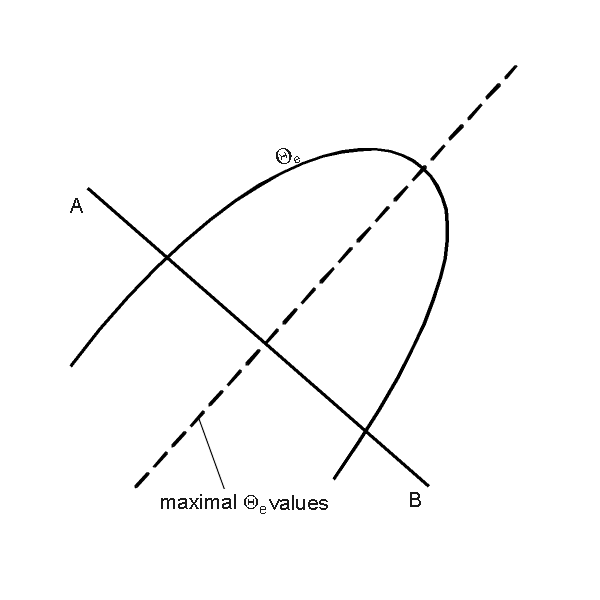 along the warmer side of this high gradient where the equivalent potential temperature has a maximum.