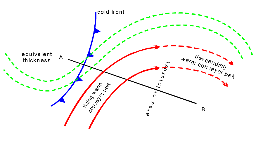 - a rising warm conveyor belt throughout a thick layer of the troposphere