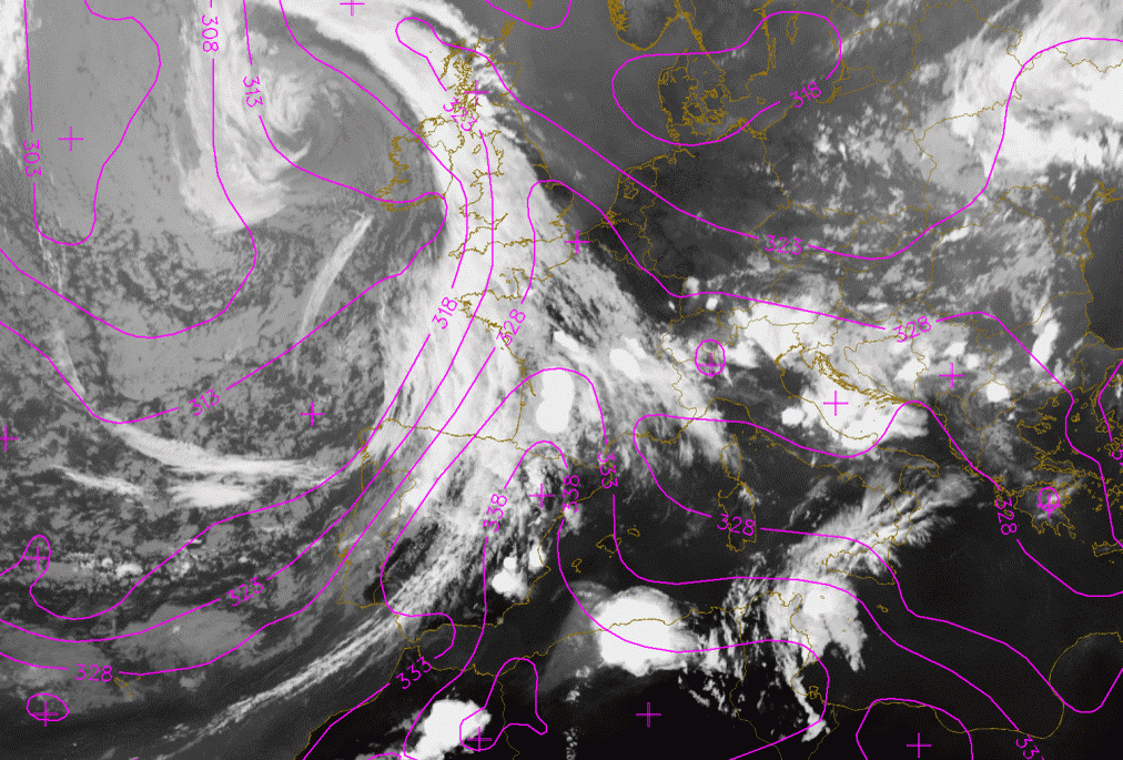 - The isentropes of equivalent potential temperature show a super adiabatic behaviour at mid-levels of the troposphere. A colder air mass overruns the lower warm air mass, resulting in unstable stratification.