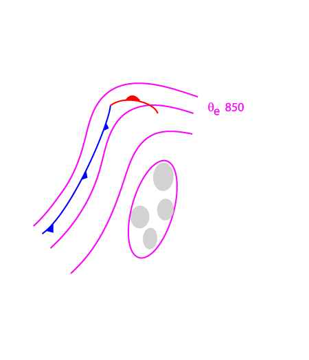Tongue of high values of ThetaE; MCS develop in the area of the maximum values
