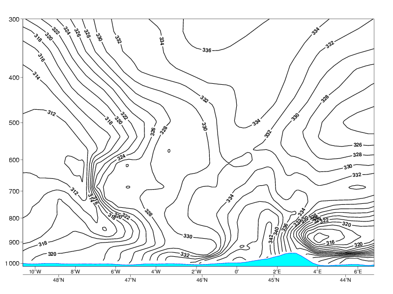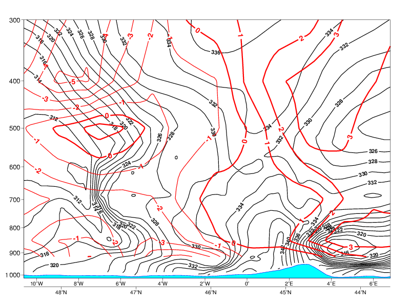 08 August 2004/18.00 UTC - Vertical cross section; black: isentropes (ThetaE)