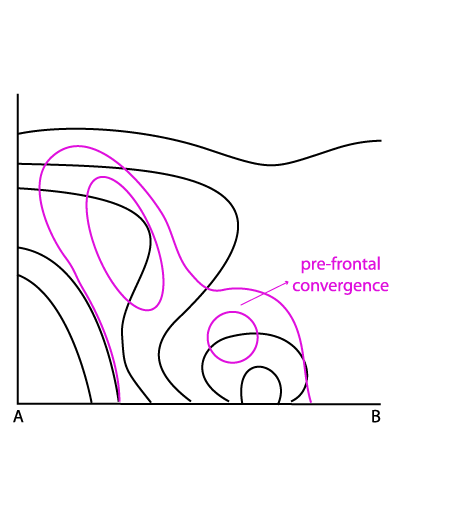 - In the field of divergence, there is typically a convergence maximum at lower levels ahead of the frontal gradient of isentropes.