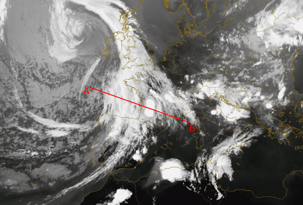 11 June 2004/18.00 UTC - Meteosat 8 IR 10.8 image; position of vertical cross section indicated