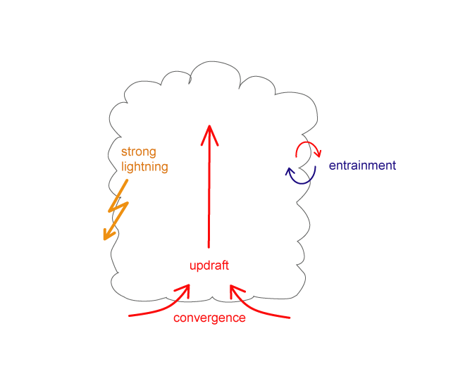 - Entrainment at the cloud edges causes the reduction of water vapour content, resulting in the evaporation of water droplets. This causes cooling and consequently reduction of buoyant energy. A supply of humidity from lower levels supports further growth of the developing cell.