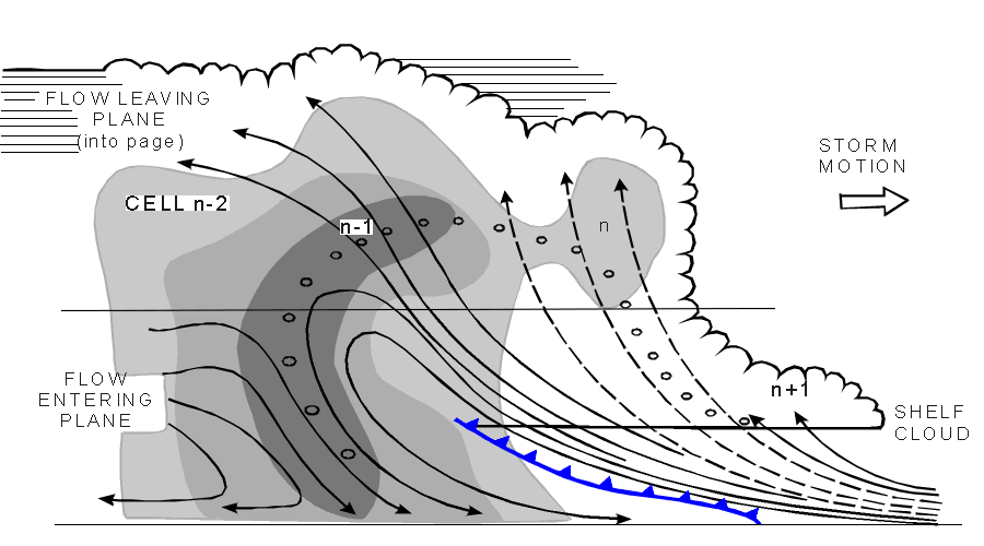 - A shelf cloud n+1 with a crisp, flat base indicating an active updraft forms ahead of cell n