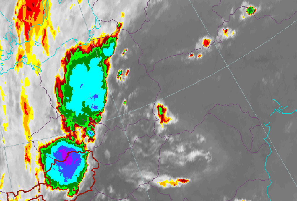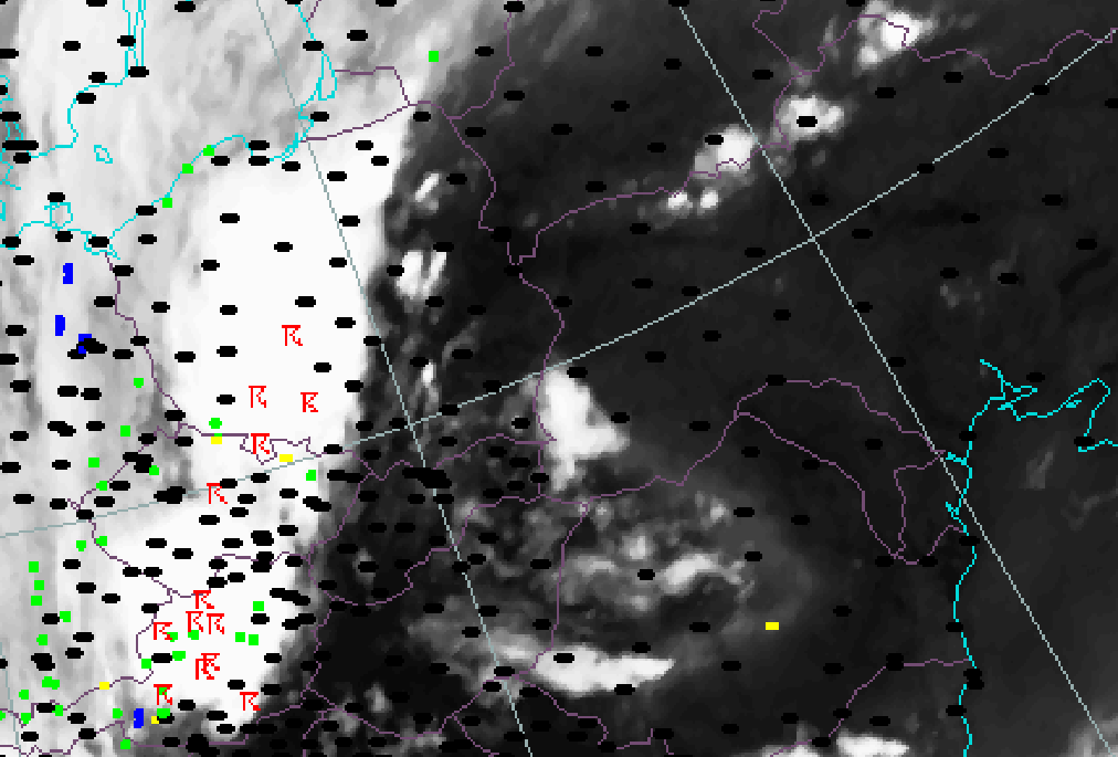 30 May 2005/18.00 UTC - Meteosat 8 IR 10,8 image; weather events (green: rain and showers, blue: drizzle, red: thunderstorm with
