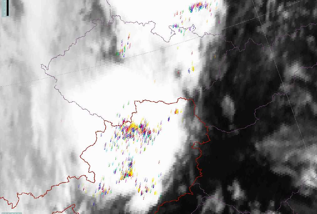 30 May 2005/18.00 UTC - Meteosat 8 IR 10,8 image; Lightning interval (yellow: 0-5 min, orange: 5-10 min, red: 10-15 min, magenta: