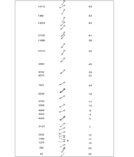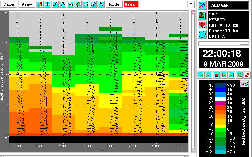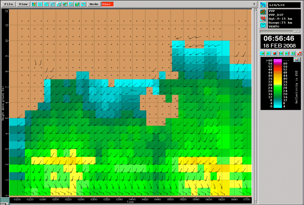 18 February 2008/01.00 - 07.00 UTC - Radar Coruche; Vertical Wind Profile (in kt) and Average Reflectivity in layers (in dBZ).