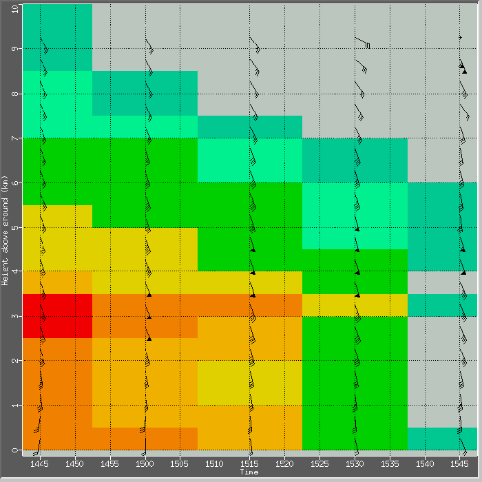 However, for the Lisbon case shown in the satellite image chapter, a LLJ was found both by model and radar in the vicinity of the affected areas. In the radar vertical profile sequence shown below, wind speeds of 35-40kt at a height of approximately 1000m were measured for several hours during the event, with a persistence veering of the wind from SE to SW in the first two km. This was also an indication of warm air advection in the lower levels and, as a consequence, increasing instability.