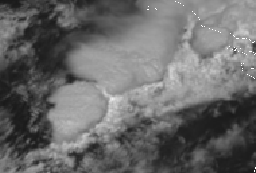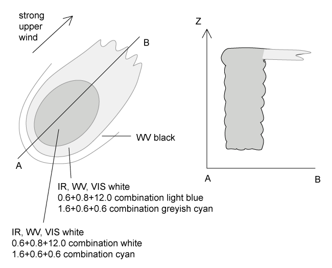 - The upstream edges of the cloud cluster are generally very sharp. In situations with strong upper level winds, the high cloud is transported downstream leading to an extended white cloud shield in the IR but a fibrous grey texture in the VIS image. The brightest areas can be found in the active part upstream.