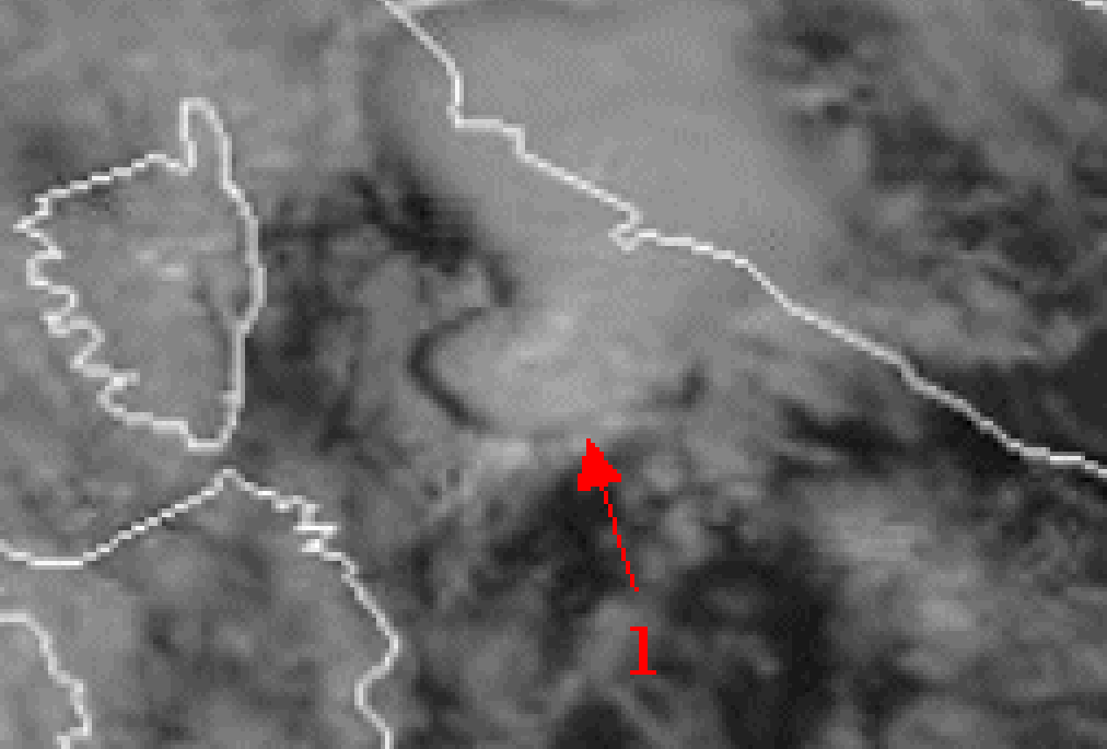 Train effect is clearly seen in satellite images making use of animations of several hours. In the animation shown below (left) for an event on 20 September 1999, the 30 minutes time resolution WV channel of Meteosat 7 can be followed between 02.00 UTC and 18.00 UTC. During the 16 hours you can see the convective area as whole moving southeastwards, with many convective systems forming over the Tyrrhenian sea.