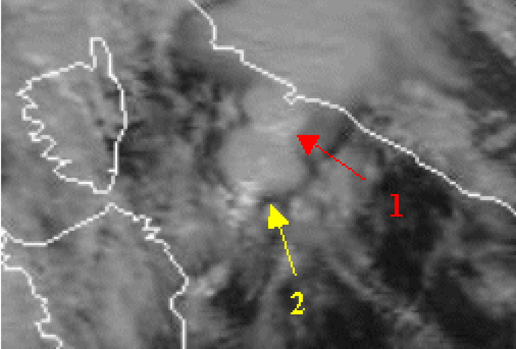 If focusing on a narrower period of time - from 07.30 to 14.00 UTC (right animation above), one can see that the convective systems are forming over the same area, as plotted below left at 10.00 UTC (cell 1 - fully developed) and below right at 11.30 UTC (cell 1 moved northeastward and a new fully developed cell - cell 2 - formed in the same area where cell 1 was 90 minutes earlier).
